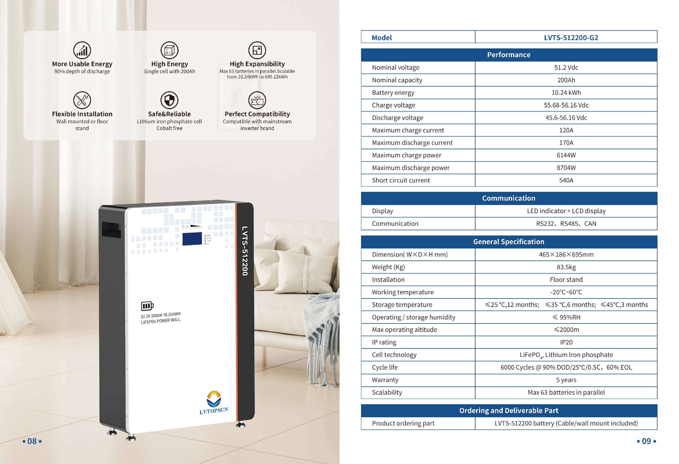 Hệ thống LVTS-512200-G2 sử dụng công nghệ pin Lithium Iron Phosphate. Pin LFP nổi tiếng về độ an toàn và tuổi thọ cao. Sản phẩm này có dung lượng danh định 10.24 kilowatt giờ.