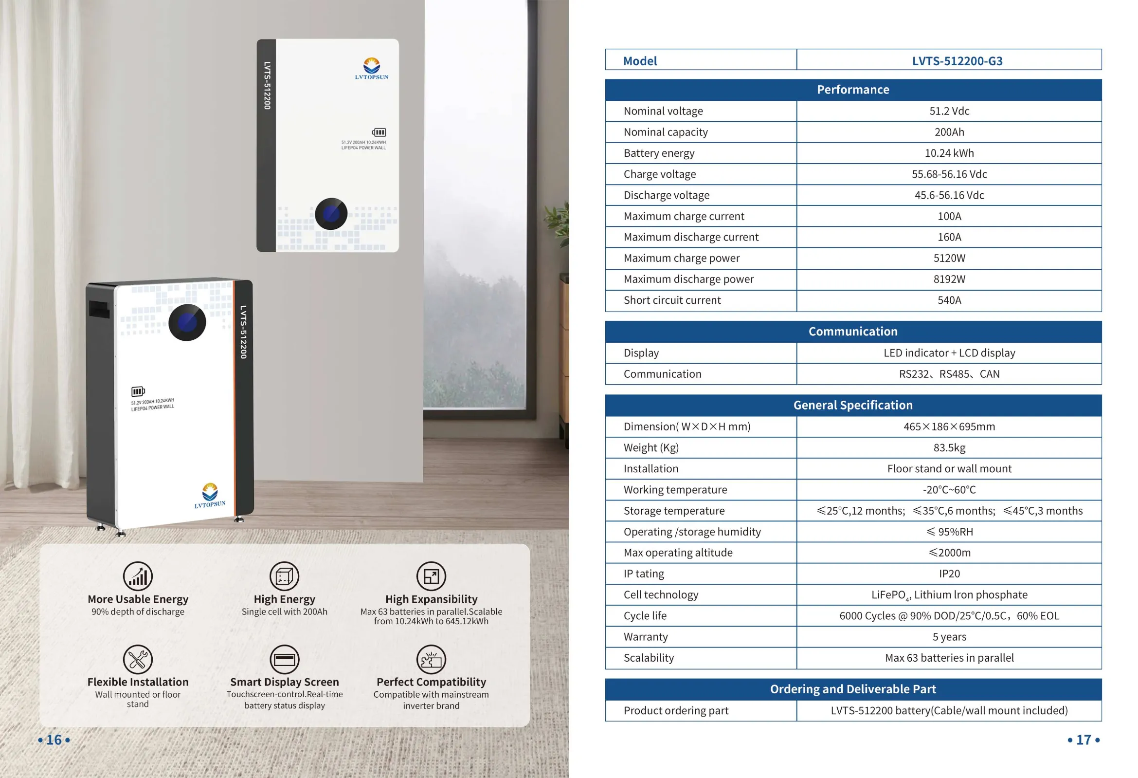 Đây là hệ thống lưu trữ pin lithium chất lượng cao. Nó do công ty LVTopSun Solar Technology Co., Ltd. sản xuất. Pin sử dụng công nghệ an toàn và đã được kiểm chứng. Bảng dưới đây tóm tắt các thông số chính.