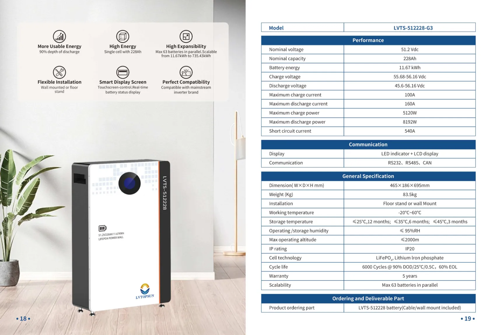Hệ thống lưu trữ năng lượng LVTS-512228-G3 sử dụng công nghệ pin hiện đại. Sản phẩm có năng lượng danh định là 11.67 kWh. Nó là giải pháp lý tưởng cho nhiều nhu cầu sử dụng. Pin có khả năng hoạt động ổn định và rất bền bỉ.