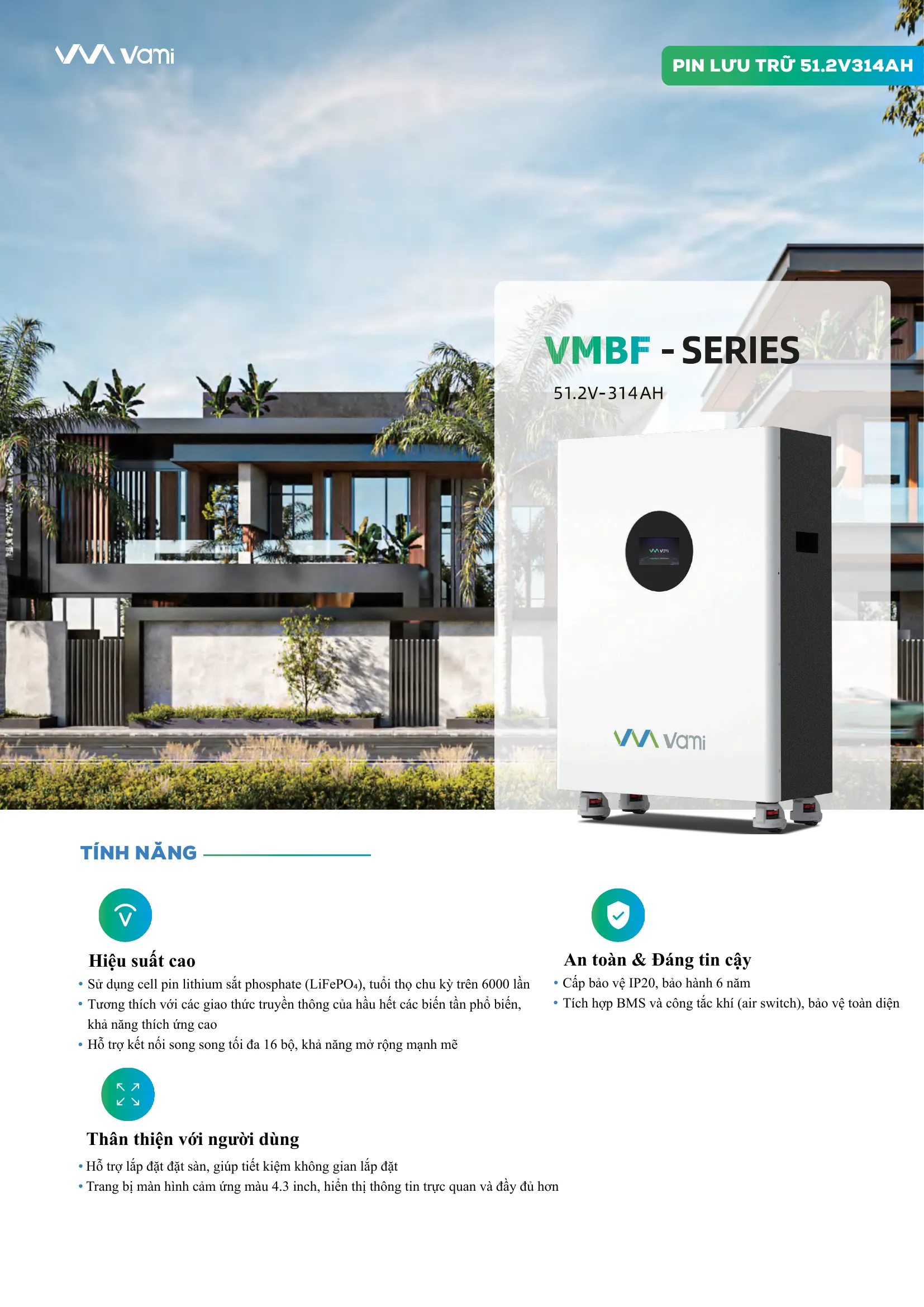 Trong xu hướng chuyển dịch năng lượng xanh, việc sở hữu một hệ thống lưu trữ điện năng tin cậy là ưu tiên hàng đầu. VAMI VMBF-51314 thuộc VMBF-Series là dòng pin Lithium sắt phosphate (LiFePO4) thế hệ mới, nổi bật với dung lượng lớn 314Ah và khả năng vận hành thông minh, an toàn tuyệt đối.