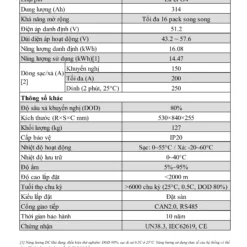 Dòng sạc/xả: 150A (Khuyến nghị), 200A (Tối đa), 250A (Đỉnh trong 2 phút)