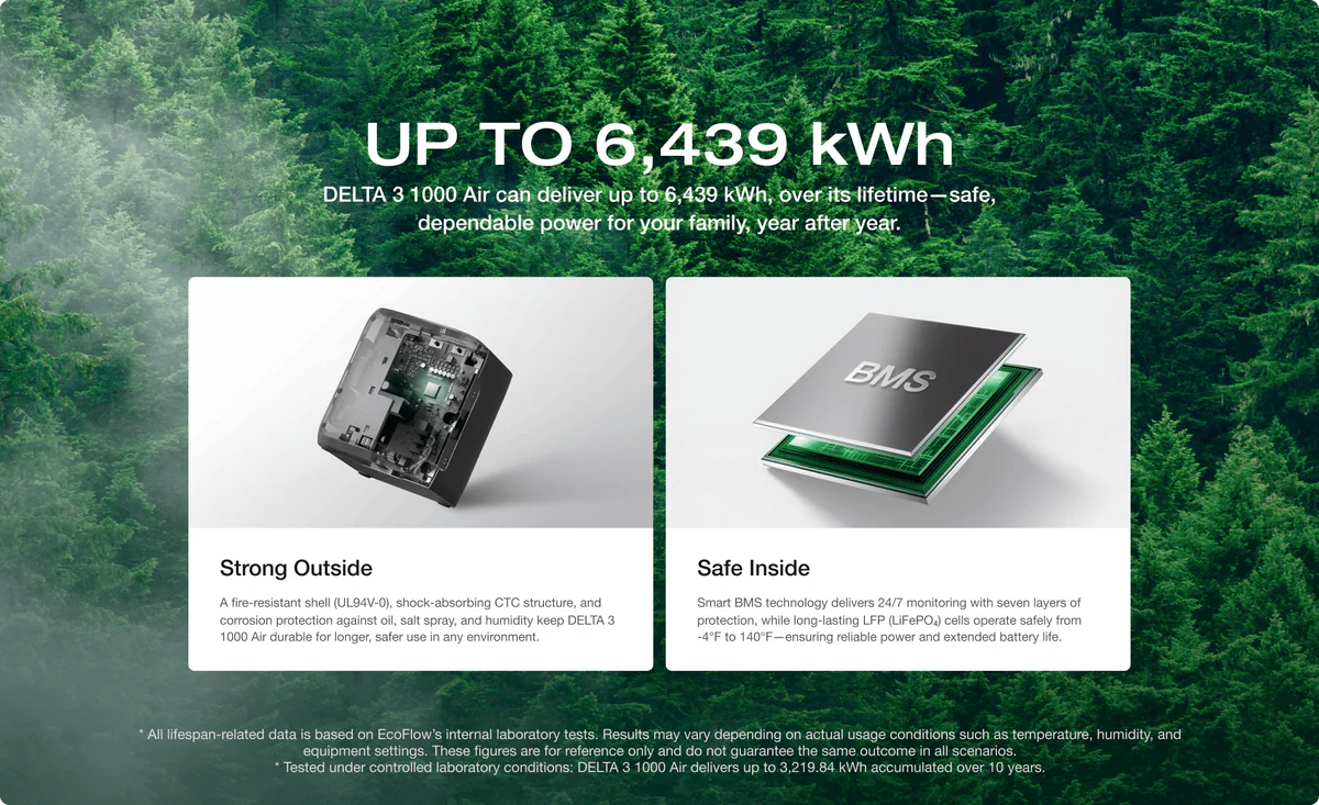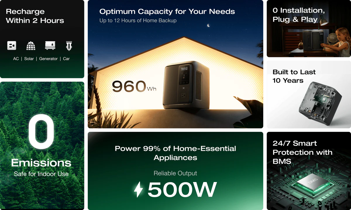 • Dung lượng: 960Wh (Sử dụng lõi pin LFP an toàn, tuổi thọ 10 năm).