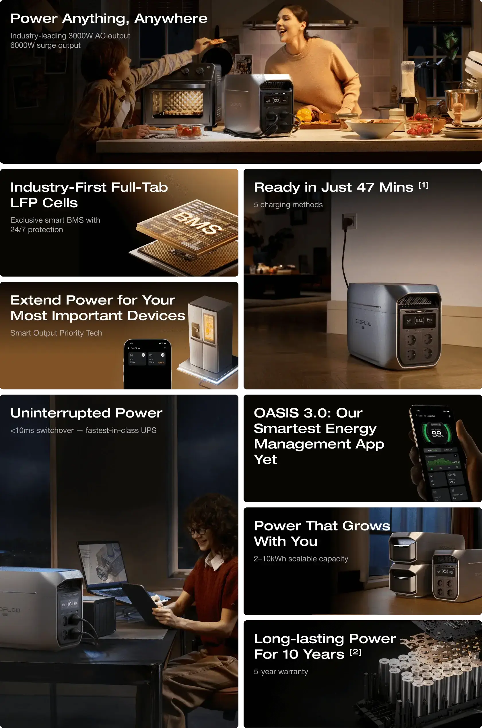 Chuyển mạch UPS < 10 ms: Trong trường hợp mất điện lưới, DELTA 3 Max Plus sẽ tự động chuyển sang dùng pin chỉ trong chưa đầy 10 mili giây. Tốc độ này đủ nhanh để các thiết bị nhạy cảm như máy tính để bàn (PC) hay thiết bị y tế không bị tắt đột ngột.
